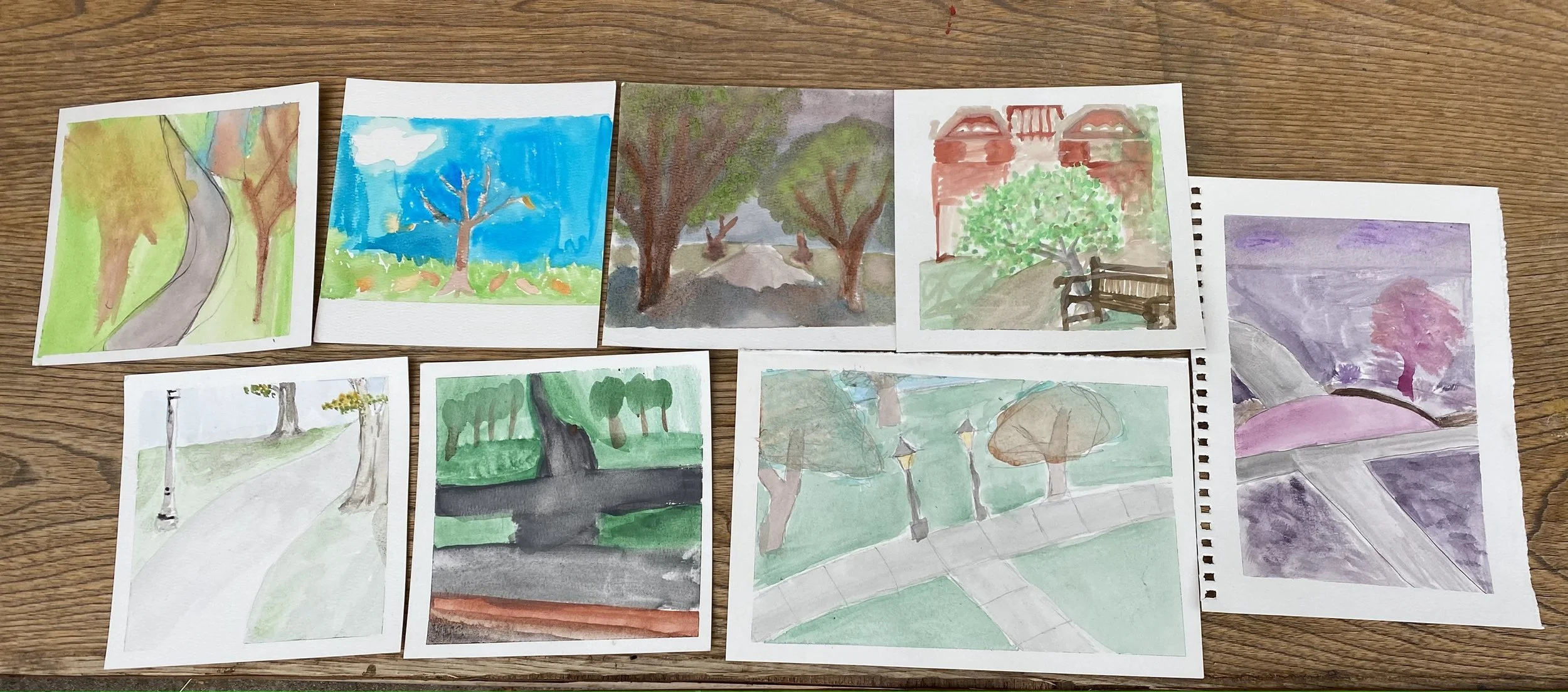 This year the Art & Movement class has taken up Plein Air painting. Plein air painting is the art of painting outside while enjoying nature. As a class we walk to the campus of Friends University and set up to paint what we see. These paintings are sketches of the natural surroundings we encounter and the architecture in front of us.