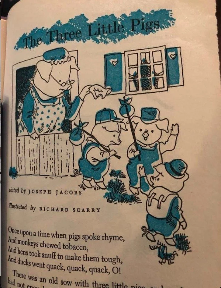 This is an image Sanda saw when she was a little girl: The Three Little Pigs, with bindles-- and a backpack!